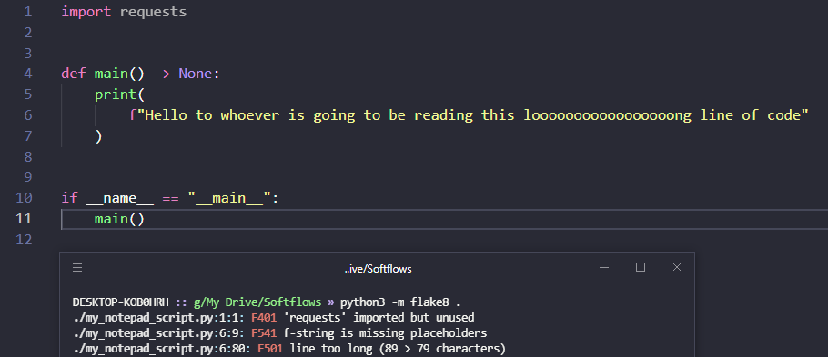 As you can see in my example above, flake8 highlighted three issues with my code, an unused import, a redundant f-string, and a line that is too long. Those are all things I should fix prior to considering my work "done" on this (very complex) project.